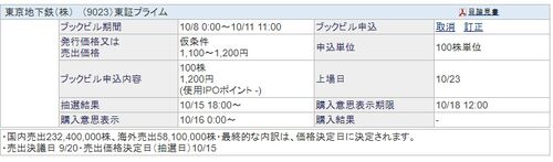 こんにちは!アラカンタロウです。 東京メトロが東証プライムに10/23上場することになり、10/8の0時からIPOのブックビルディングが出来るようになったので懲りずにIPO申し込みました。 予想金額は1,100~1,200円でしたので、私は1,200円で100株申し込みまし…