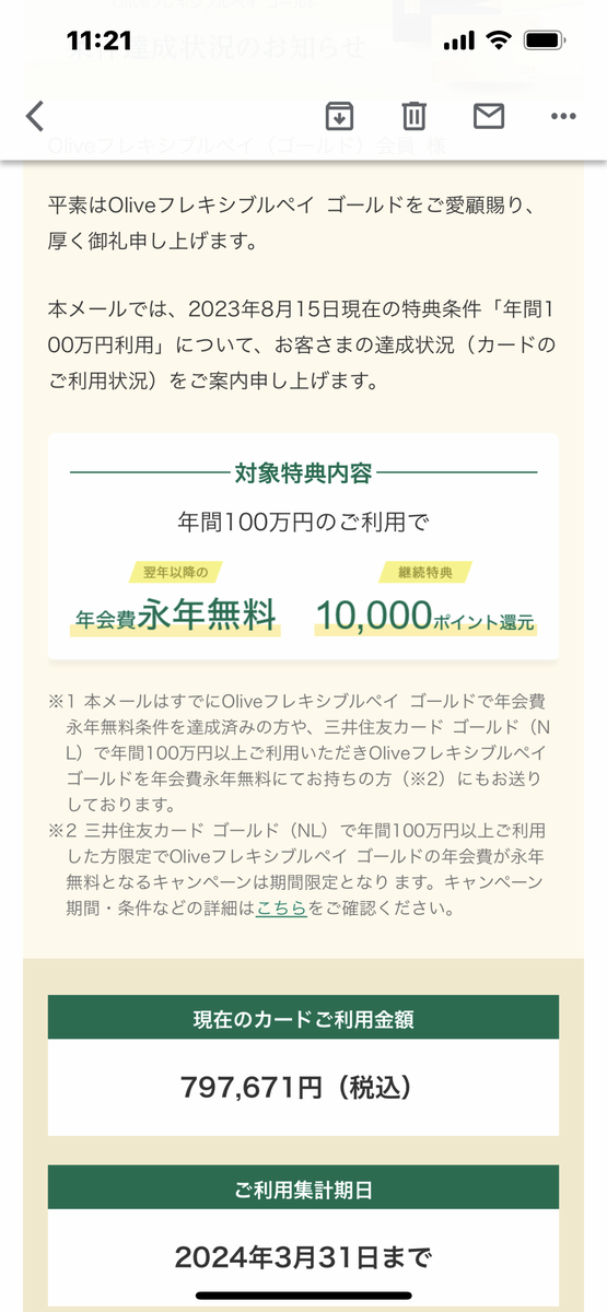 今年は三井住友NLゴールドで100万円使用については既に達成済みで、その後は三井住友Oliveゴールドカードをメインに使っています。